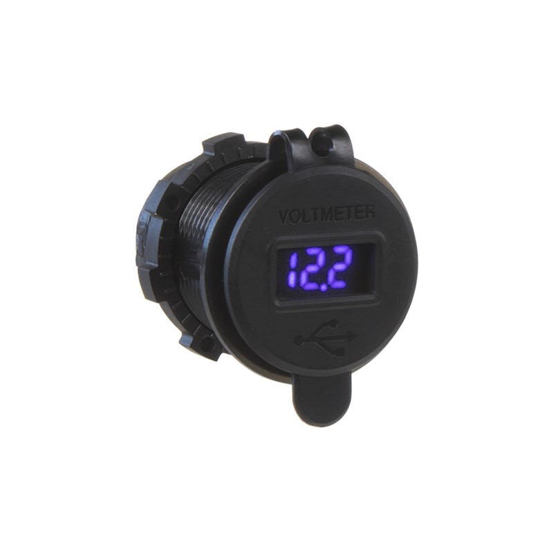 2x USB nabíječka s voltmetrem do panelu, s krytkou proti prachu a vlhkosti, modrý LED displej.