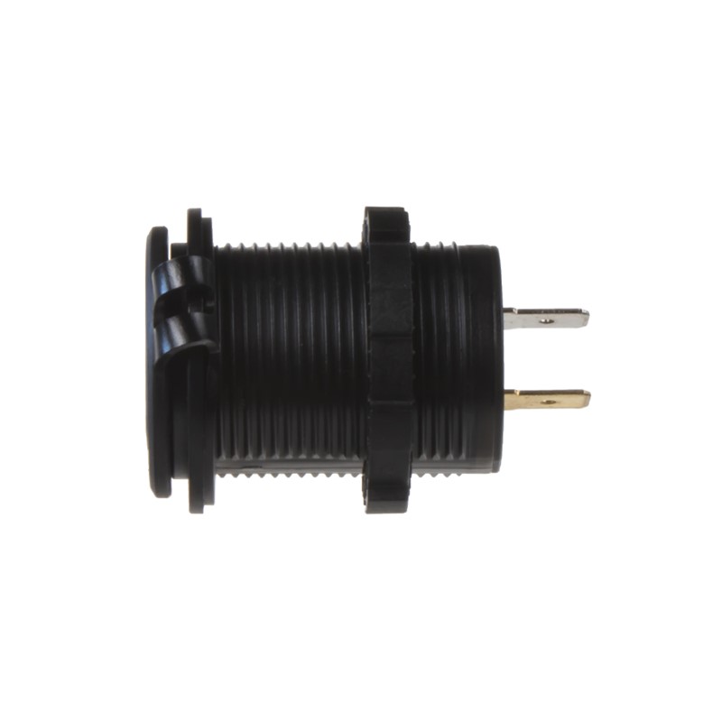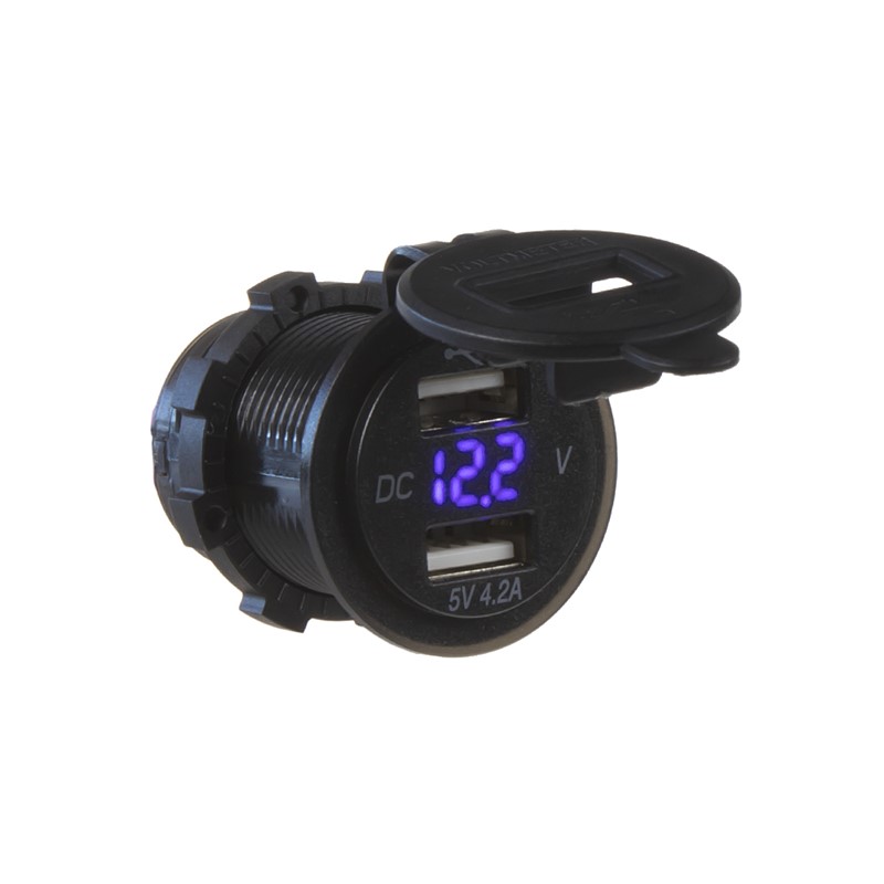 Krátký popis 2x USB nabíječka s voltmetrem do panelu, s krytkou proti prachu a vlhkosti, modrý LED displej.
