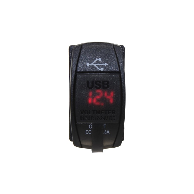 2x USB nabíječka s voltmetrem v provedení ROCKER, s krytkou proti prachu a vlhkosti, červený LED displej.