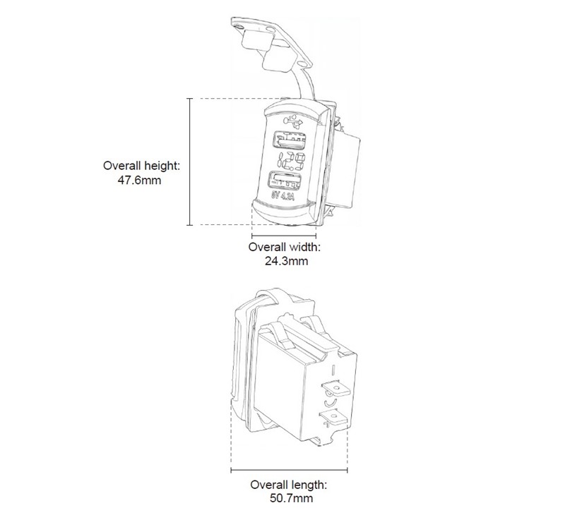 Krátký popis 2x USB nabíječka s voltmetrem v provedení ROCKER, s krytkou proti prachu a vlhkosti, modrý LED displej.