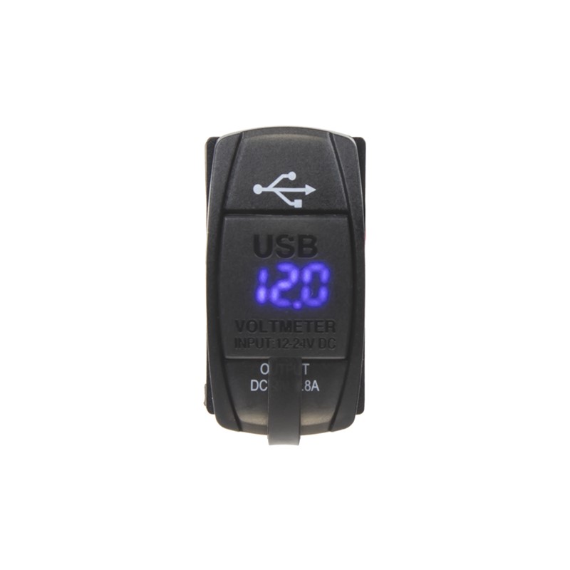2x USB nabíječka s voltmetrem v provedení ROCKER, s krytkou proti prachu a vlhkosti, modrý LED displej.