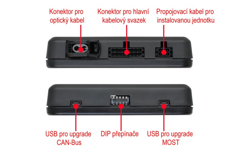 Automobily s OEM jednotkou PCM3.1 připojenou FAKRA konektorem a OEM aktivním audio systémem připojeným optickým kabelem MOST25.