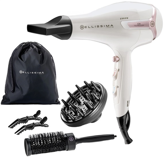 Bellissima, profesionální AC motor, ionizace, 2 rychlosti, 3 teploty, studený vzduch, odnímatelný filtr, 1,8 m kabel, nástavce: tradiční úzká tvarovací koncovka, difuzér, součástí je i kulatý kartáč O 42 mm, 2 klipy, kosmetická taška, 2300 W