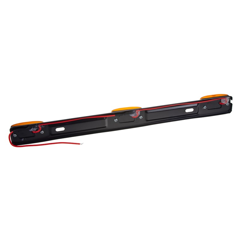 Přídavné zadní obrysové (poziční) červené LED světlo, vhodné k osvětlení nákladních vozidel, kamionů, návěsů   Technické parametry • napájecí napětí 12-24 V • proudový odběr 100 mA/ 12 V • 3 světla na černém lakovaném plechu pro uchycení • obsahuje 9 vysoce svítivých LED diod 3030SMD • rozměry 360 x 31 mm • výška 28 mm • rozteč šroubů 204 - 222 mm