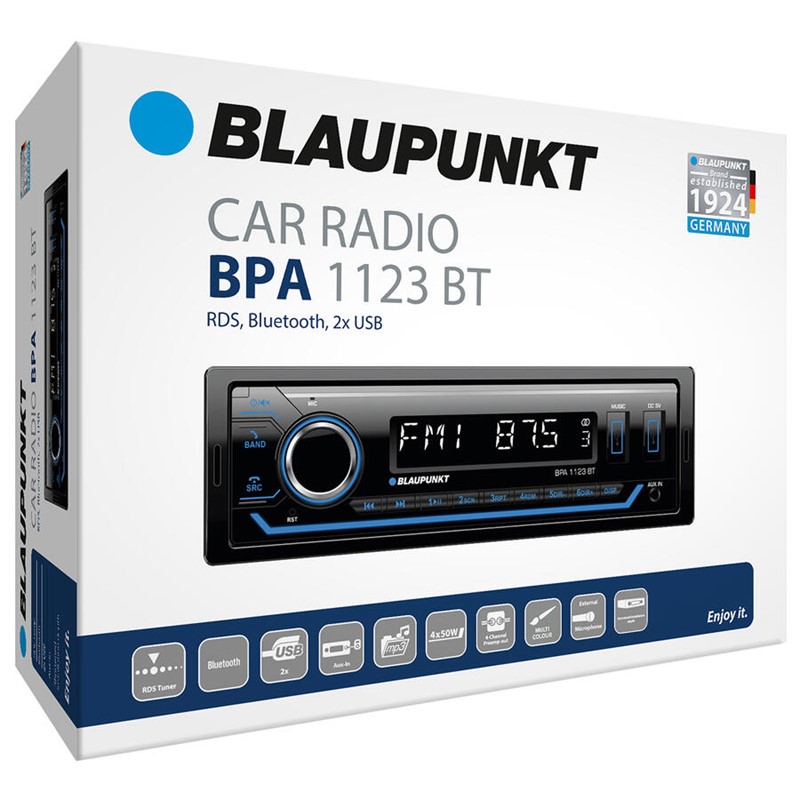 • Autorádio Blaupunkt RDS/MP3/Bluetooth „BPA 1123 BT“ ve formátu 1-DIN nabízí nový, moderní design s vícebarevným osvětlením. Je speciálně navrženo pro přehrávání digitálních médií. Přímo na zařízení je k dispozici další USB port pro nabíjení mobilních zařízení. Díky ergonomickému otočnému knoflíku nabízí „BPA 1123 BT“ optimální snadnost použití.
