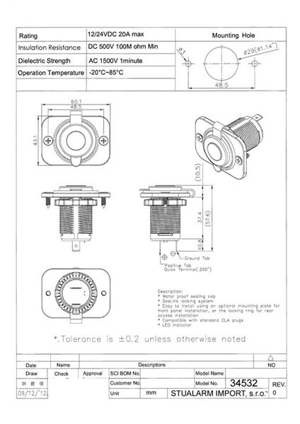 Krátký popis CL zásuvka voděodolná do panelu.   Technické parametry: • napájecí napětí: 12 V / 24 V • maximální zatížení: 20 A • ø montážního otvoru: 29 mm • rozměry: 43 mm x 60 mm, 57,6 mm (hloubka) • podsvětlení: modrá LED