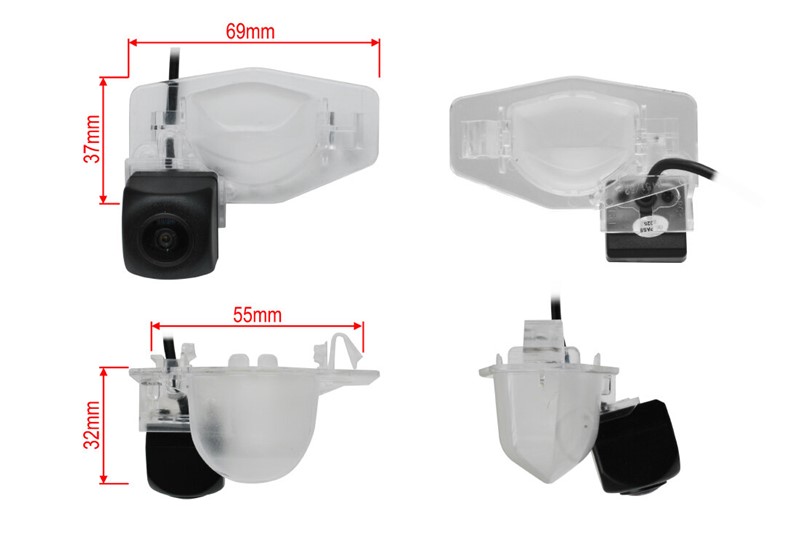 CMOS parkovací kamera pro instalaci do lampy pro osvětlení zadní registrační značky. Součástí kamery je průhledný kryt pro krytí původní žárovky osvětlující registrační značku.