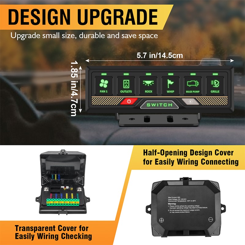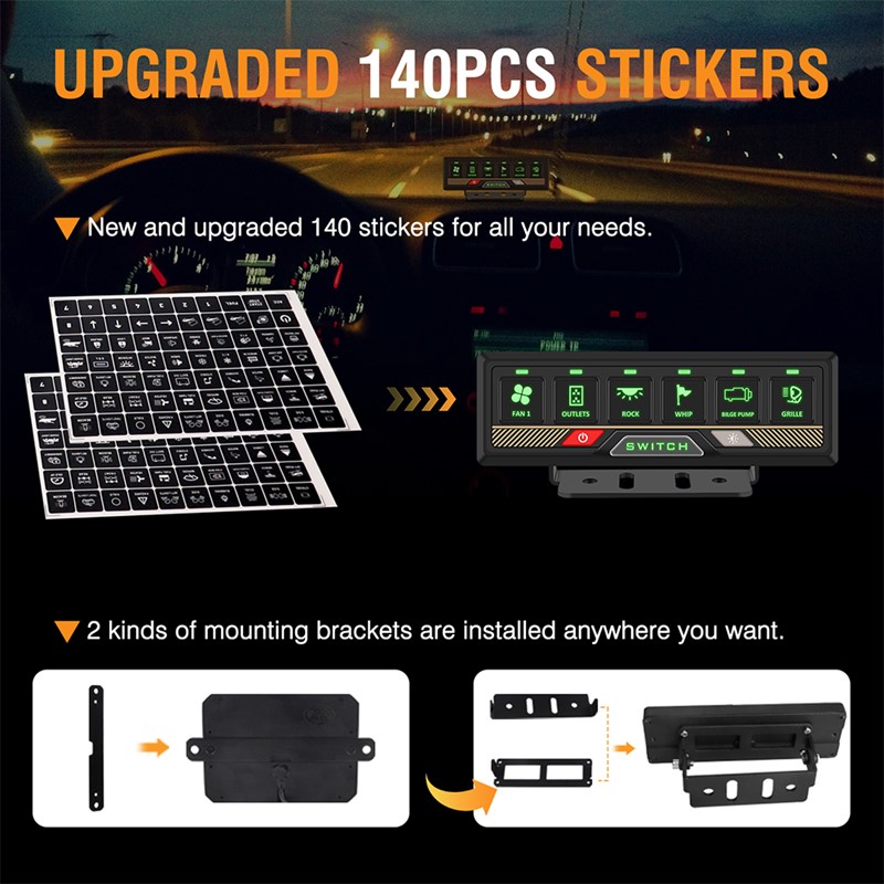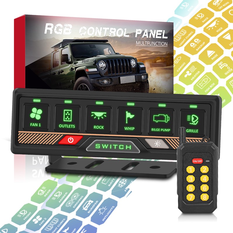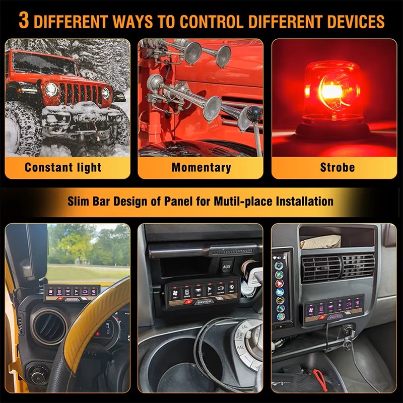 Snadno nainstalujete do 12 V a 24 V vozidel. Je vhodný pro různé typy automobilů, terénní vozidla, pickupy, nákladní vozy atd. Různé spínače pro ovládání obecného elektrického vybavení ve vozidle: světlomety a jiná zařízení. Ovládací panel lze instalovat na přístrojovou desku, středovou konzolu, sedadlo, strop, A-sloupek ve vozidle atd. Možnost ovládání z mobilního telefonu přes Bluetooth pomocí aplikace Mgroup light, nebo pomocí přiloženého dálkového ovladače. Přizpůsobitelné samolepicí štítky, které vám pomohou určit každé tlačítko podle vašich konkrétních potřeb (celkem 140 ks).