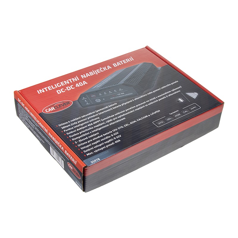 DC-DC 40 A Inteligentní nabíječka baterií je určena k nabíjení sekundární (pomocné) baterie během jízdy pomocí primární (startovací) baterie připojené k alternátoru nebo pomocí solárního panelu.