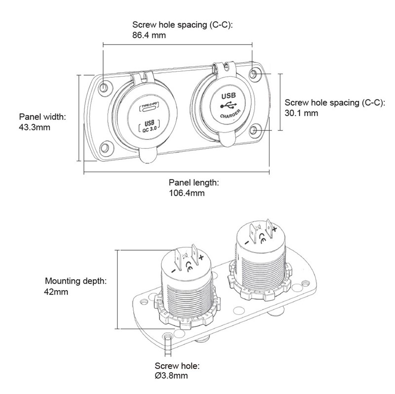 Krátký popis Dvojitá zásuvka do panelu 2x USB-A (3,1 A) + 1x USB-A (QC3.0) + 1x USB-C (PD) nabíječka voděodolná.