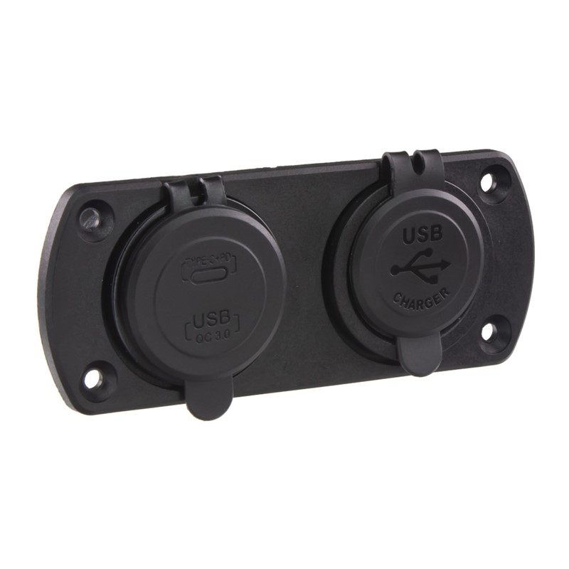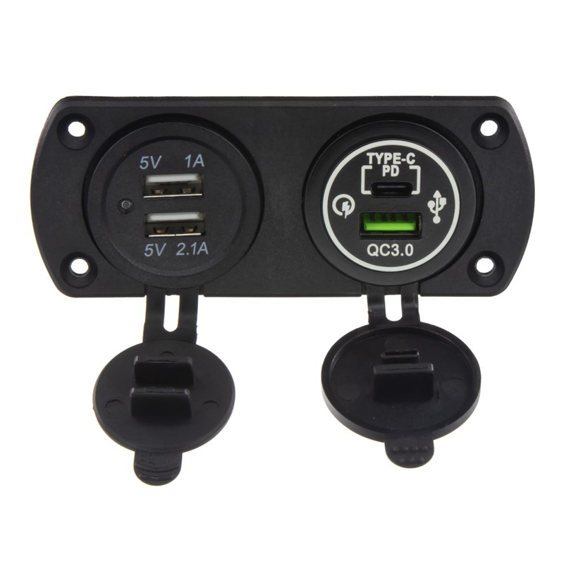 Dvojitá zásuvka do panelu 2x USB-A (3,1 A) + 1x USB-A (QC3.0) + 1x USB-C (PD) nabíječka voděodolná.