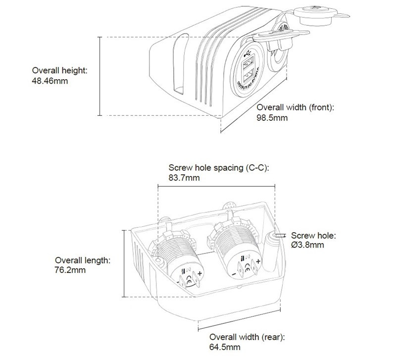 Krátký popis Dvojitá zásuvka s panelem 1x CL + 2x nabíječka USB voděodolná.   Technické parametry: • nap