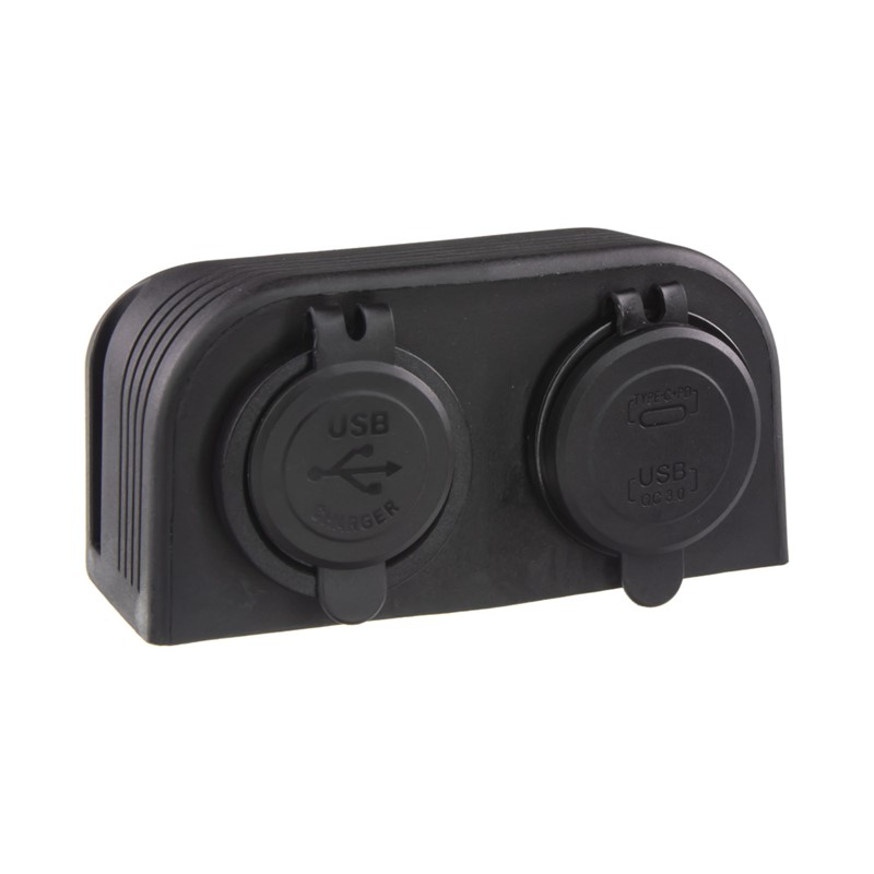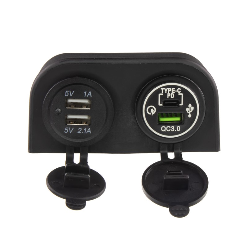 Dvojitá zásuvka s panelem pro samostatnou montáž, 2x USB-A (3,1 A) + 1x USB-A (QC3.0) + 1x USB-C (PD) nabíječka voděodolná.