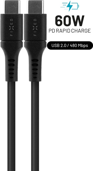 Krátký popis Dlouhý nabíjecí a datový Liquid silicone kabel FIXED s konektory USB-C/USB-C a podporou PD, 2m, USB 2.0, 60W, černý