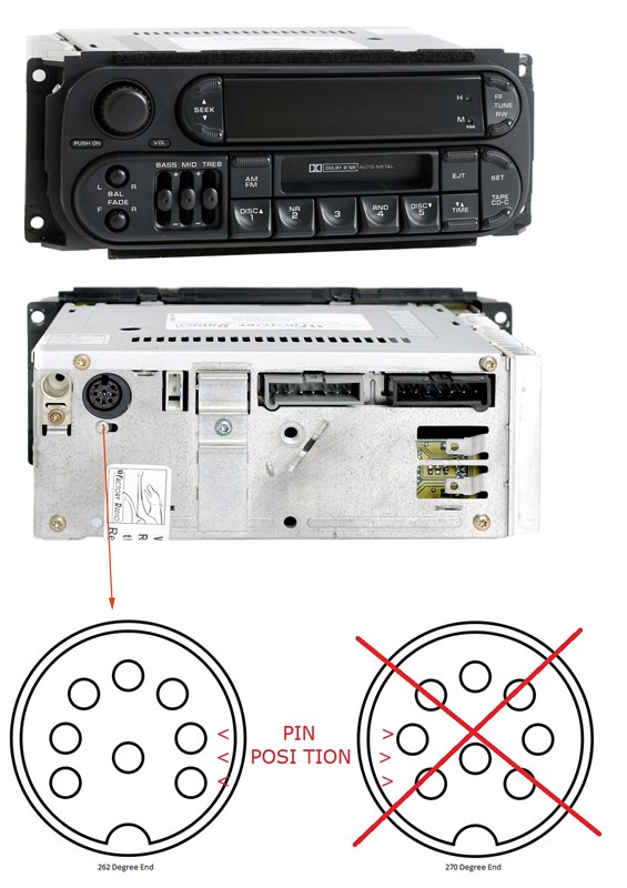 Upozornění: určeno pouze pro autorádia: 1998-02 Chrysler Dodge Jeep AM FM Radio CS w CD Controls RBB, nelze použít s rádiem Jeep/Chrysler s vestavěným CD měničem. Rádio musí podporovat ovládání CD měniče - připojení měniče kulatým 8-pinovým konektorem 262° (nelze použít u rádií, kde je standartní DIN konektor).