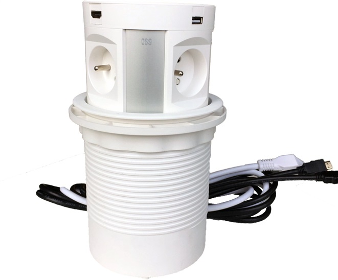 Je určena pro montáž do kancelářských stolů, kuchyňských linek apod.Instalace je jednoduchá stačí vyvrtat otvor o průměru 12 cm děrovací pilou.Tento blok má bezdrátové Qi nabíjení v krytu, 4 zásuvky a 2 USB výstupy, 2xHDMI výstupy (rozmístěné dvoustranně) včetně 2x2m HDMI kabelu. Technická charakteristika: 1 bezdrátové Qi nabíjení,4x zásuvky 2P+T,2x USB výstup 5V 2,4A,2x HDMI výstup,16A, 230V~ MAX 3680W,kabel: 1.5mm2, 2m,2x2 m HDMI kabel