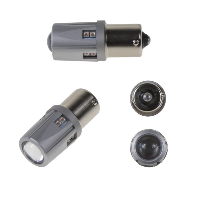 Nová generace LED autožárovek s paticí BA15S, oranžová, 12 x super svítivý LED čip 5 W + rozptylová krycí čočka.