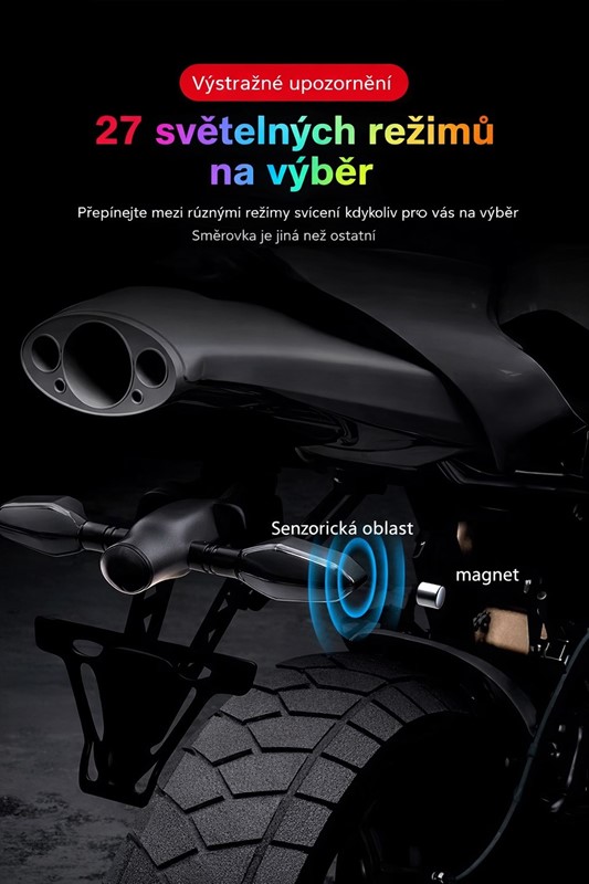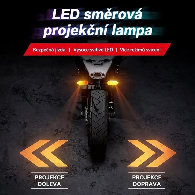 2 ks LED směrová světla s projekcí šipky + RGB pulzující efekt. Unikátní LED blinkry pro motocykly, skútry a čtyřkolky s funkcí projekce šipky na vozovku. Při zapnutí blinkru se kromě klasického žlutého směrového světla promítne na silnici jasná šipka, která výrazně zvyšuje viditelnost pro ostatní účastníky silničního provozu.
