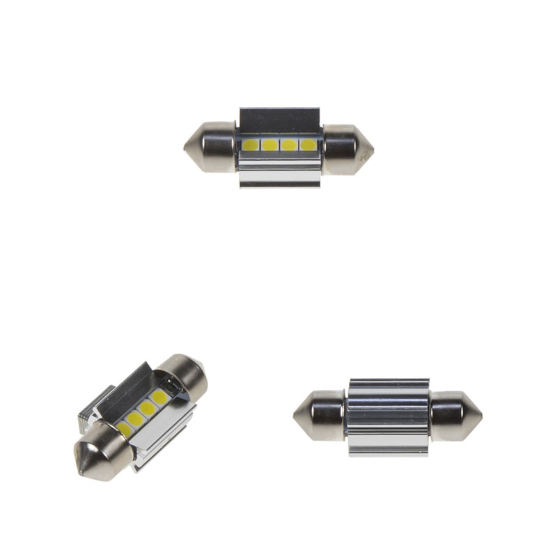 LED žárovka s paticí sufit (31 mm), bílá, s vestavěným rezistorem (nehlásí závady řídící jednotky na žárovce u nových vozidel) a chladičem, 4x vysocesvítivé SMD LED diody 3030SMD.