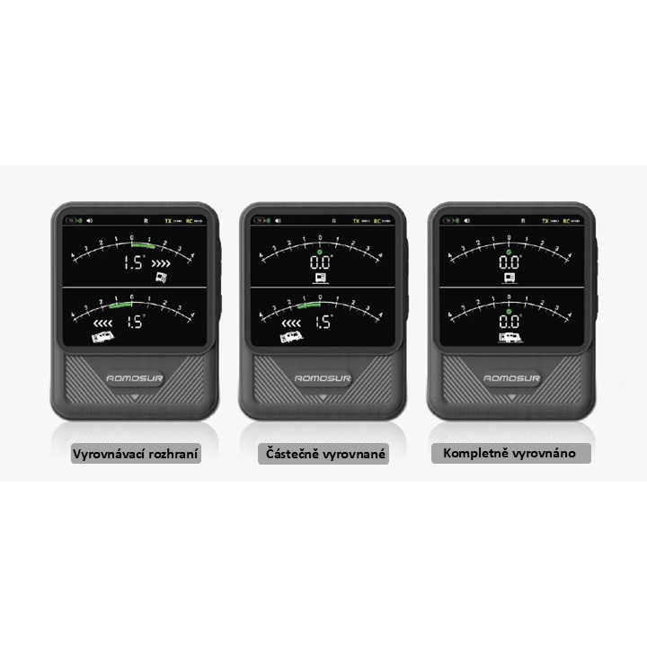 Displej: Přenosné zařízení zobrazuje náklon v reálném čase. Grafické rozhraní poskytuje vizuální indikace, které usnadňují rychlé vyrovnání.