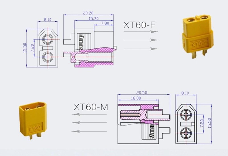 Krátký popis Univerzální napájecí konektor XT60 samice+samec, 2-pólový. Maximální zatížení až 60 A