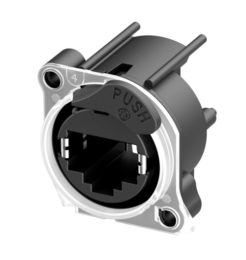 Zásuvka etherCON s unikátní funkcí Neutrik Halo a asymetrickým nekovovým zatlačovacím jazýčkem.