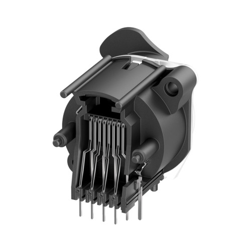 Horizontální zásuvka RJ45 pro montáž na desku plošných spojů, výřez řady A se západkou, max. tloušťka panelu 3 mm a asymetrický nekovový zatlačovací jazýček.