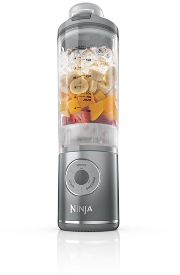 přenosný mixér; plastová nádoba 0,57 l; technologie Ninja Blast™: rovnoměrné rozmixování; vhodné pro přípravu smoothie, zeleninového pyré, zmrzliny nebo na drcení ledu; přenosná láhev; plastové víko; nabíjecí baterie o výkonu 13,3 V; kompatibilní s USB-C