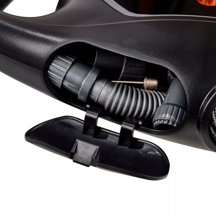 Součástí dodávky je síťová nabíječka a 12 V kabel s CL koncovkou pro případné přímé napájení. Součástí balení je také 10dílná sada adaptérů, úložná taška a náhradní krytky ventilků.