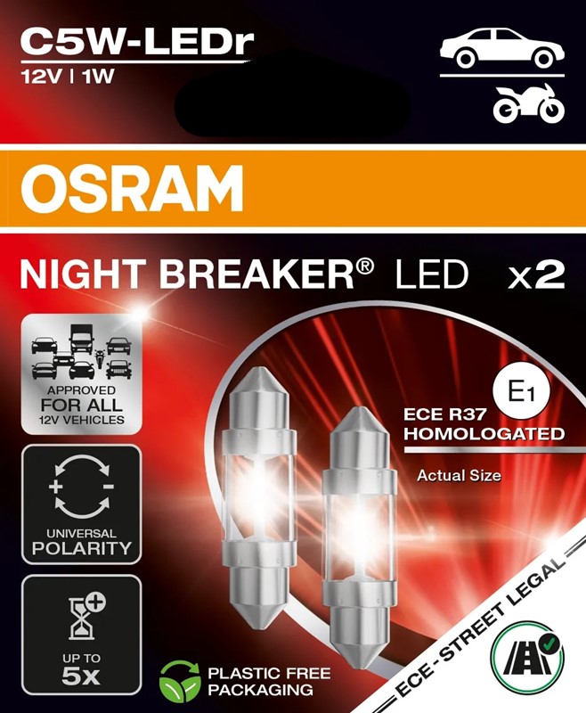 Nová OSRAM NIGHT BREAKER LED C5W ECE je plně homologována podle ECE R37, což znamená, že je schválena pro všechna vozidla 12 V ve všech členských státech ECE pro všechny osvětlovací funkce, kde je typ C5W vhodnou náhradou (1).