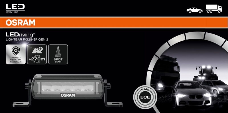 LEDriving Lightbar FX125-SP GEN 2 poskytuje dodatečné osvětlení blízkého i vzdáleného pole na tmavých silnicích se světelným tokem až 1300 lumenů.