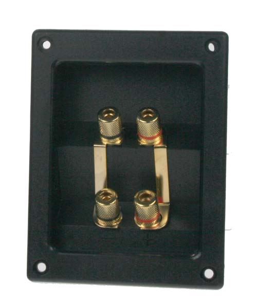 Krátký popis Obdélníková 4-pólová připojovací svorkovnice reproduktorového boxu zlacená.   Technické parametry rozměry: 120 mm x 95 mm / 95 mm x 75 mm