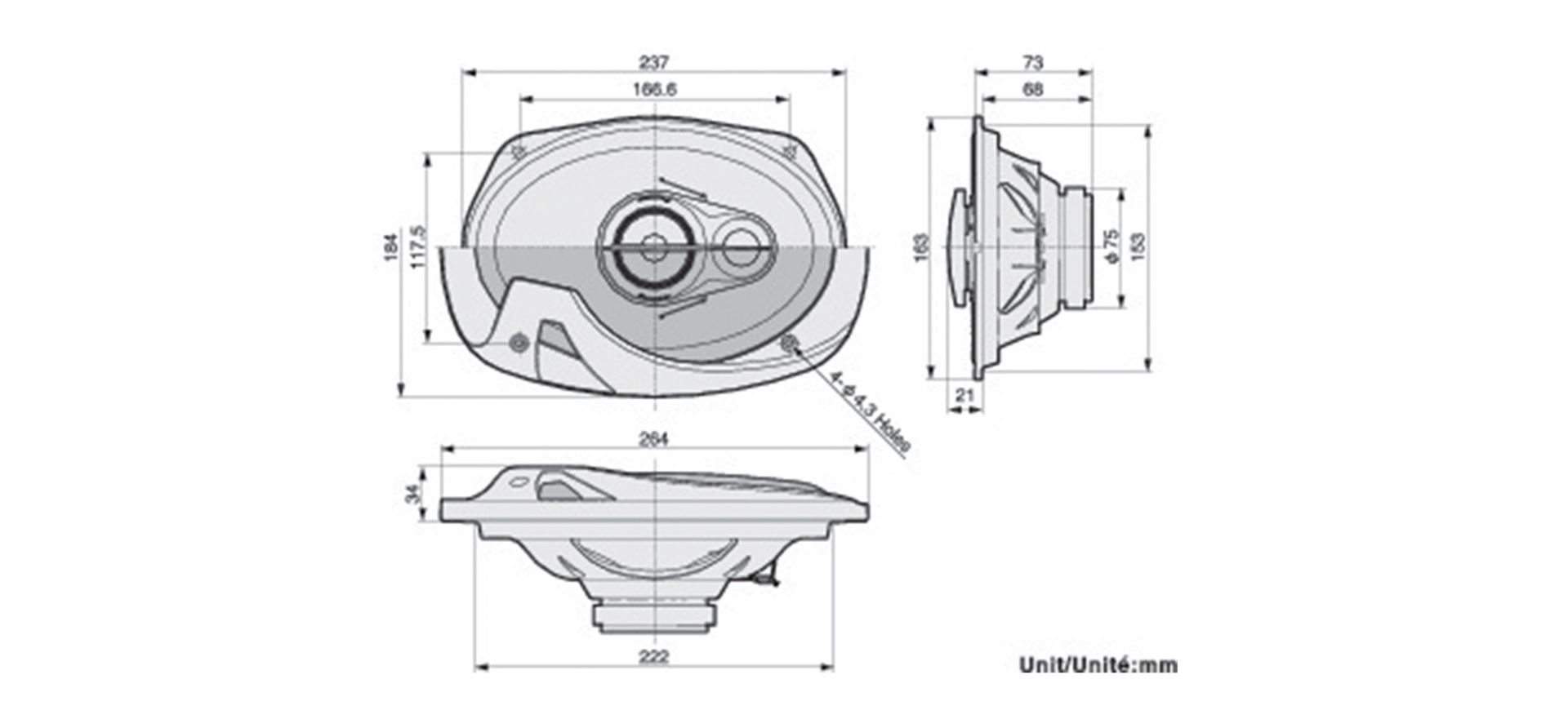 3-pásmové oválné reproduktory 6 x 9" palců (163 x 237 mm),