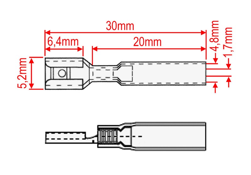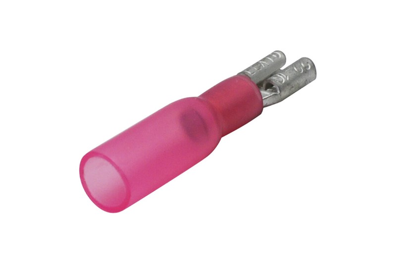 Poloizolovaný konektor faston - samice plochá 4,8 x 0,8mm izolovaná teplem smrštitelnou trubicí s lepidlem.