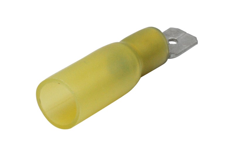 Poloizolovaný konektor faston - samec plochý 6,3 x 0,8mm izolovaná teplem smrštitelnou trubicí s lepidlem.