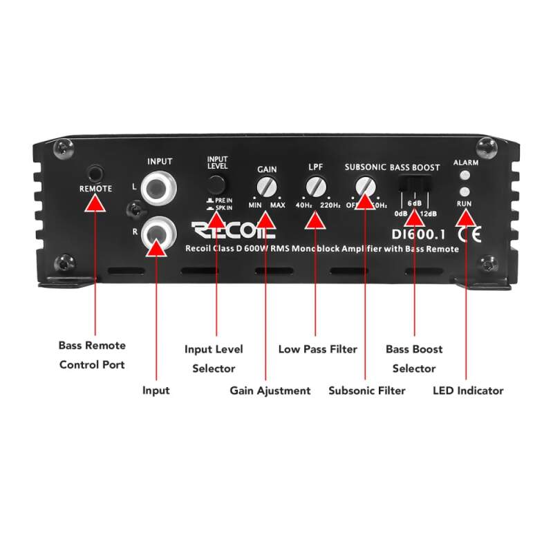 Monoblokový subwooferový zesilovač do auta DI600.1 třídy D, maximální výkon 1200 W, stabilní 2/4 Ohm, napájecí zdroj Mosfet, ovladač pro dálkové basy součástí balení