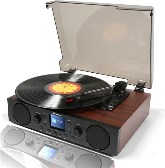 BT, digitální tuner DAB/DAB+/FM rádio, rychlost otáček 33,45,78 ot./min., vstupy: USB, SD karta, AUX 3,5mm jack, výstupy: Line RCA, 2,4" TFT barevný displej, time-sleep, budík, MP3, 2 x alarm, snooze, dálkové ovládání, výkon: 2 x 1,5 W RMS, 24 W PMPO