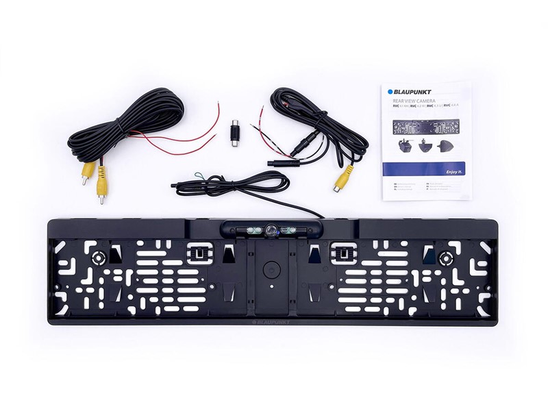 • - Obsah dodávky: kamera do držáku poznávací značky, 2 m připojovací kabel, 6 m prodlužovací kabel, RCA adaptér