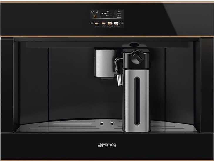 Krátký popis Kompaktní Espresso automatický kávovar, 45 cm, Eclipse-tmavé sklo, dekorativní měděná lišta, 4,3" TFT-grafický barevný displej s texty a piktogramy, 13 druhů horkých nápojů, termo-nádoba na mléko 0,5 l, Cappuccino-napěňovač mléka, dvojitý Thermoblock, oce