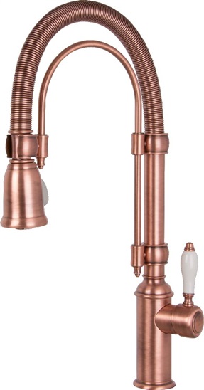 Nostalgie jednopáková baterie, provedení starožitná měď, výška 550 mm, otočné rameno z nerezové oceli vedené spirálovou pružinou, poloprofesionální ruční sprcha se 2 proudovým systémem, funkce úspory energie ESC, funkce úspory vody WSC
