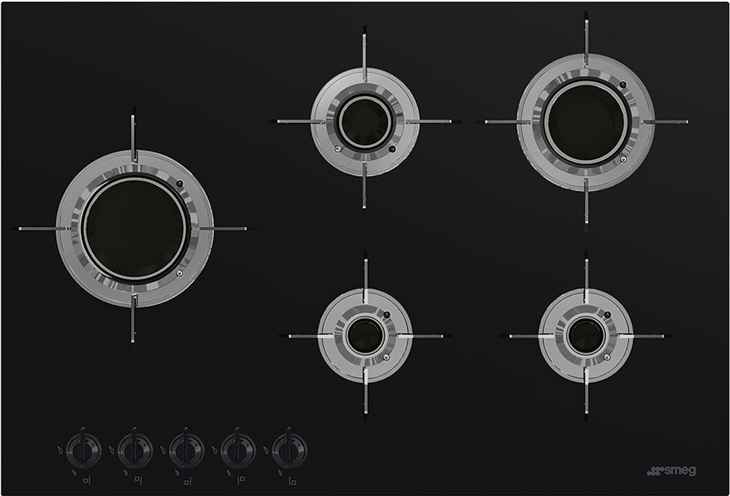 Plynová varná deska, 75 cm, černá sklokeramika, mřížky z oceli s titanovým povrchem, počet varných zón 5, technologie hořáků Blade-Flame