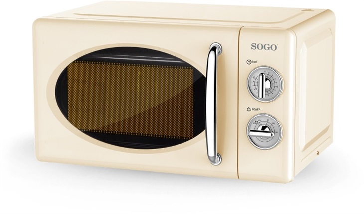 Mikrovlnná trouba. Kapacita 20 l. RETRO design s chromovanou rukojetí. Časovač na 30 min. Termostat pro nastavení teploty. Skleněný otočný talíř o průměru 245 mm. Zvukový signál. Dětská pojistka. Příkon: 700 W. Barva: béžová
