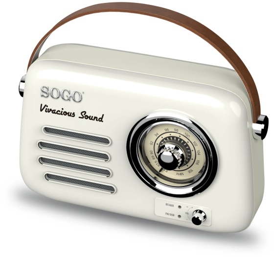 Retro rádio s bluetooth SOGO SS-8640.; Dobíjecí retro rádio s připojením bluetooth pro přehrávání hudby z telefonu, tabletu nebo jiného zařízení podporující technologii bluetooth.