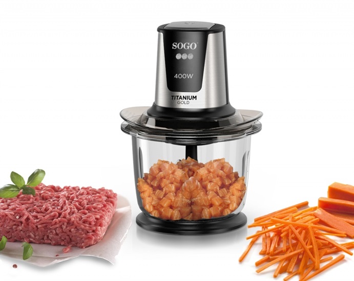 Sekáček / Chopper SOGO SS-5260, příkon: 400W, 4 titanové čepele, skleněná mísa o objemu 1,5 l.,, kovový převod, ochrana proti přehřátí, spuštění zatlačením horního víka, snadné čištění, protiskluzová základna