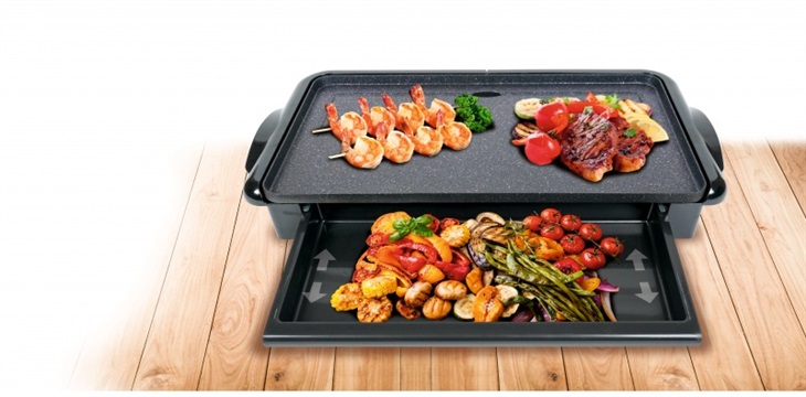 Elektrický granitový Gril, s výsuvným a vyjímatelným podnosem pro zapékání sýrů, zeleniny apod. a tepelné udržování již ugrilovaných pokrmů apod.. Velká granitová grilovací deska o velikosti 46 x 26 cm. Příkon: 2000 W
