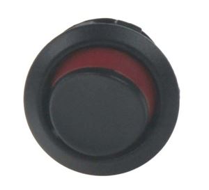 Spínač kolébkový kulatý 16 A. V poloze zapnuto vystupuje červený okraj. Max. proud / napětí: 10 A / 250 VAC, 16 A / 125 VAC.