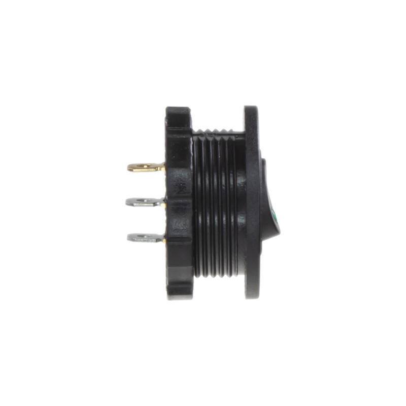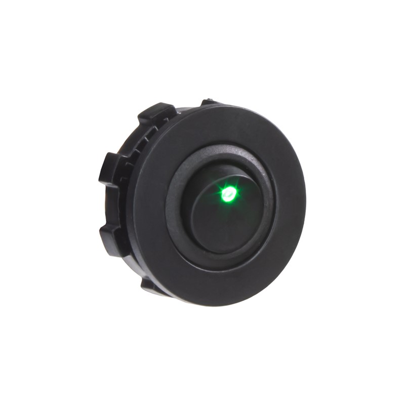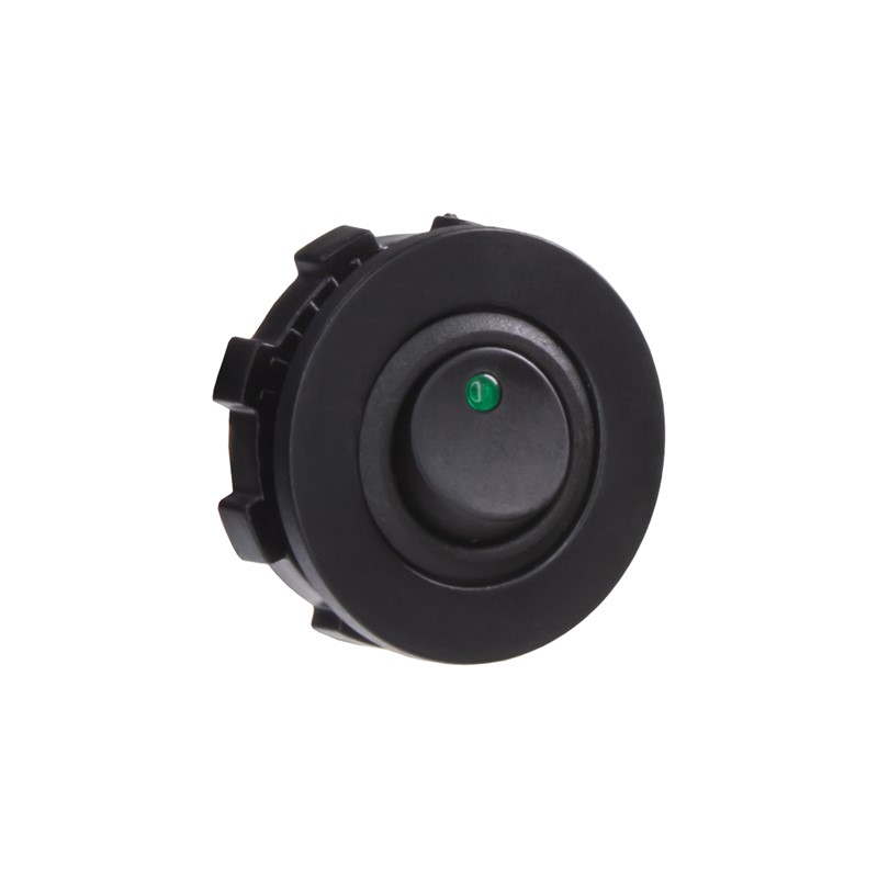 Spínač kolébkový kulatý 20A zelená LED. Spíná kladné napětí mezi kontakty 1 a 2, na kontaktu 3 je kostra pro podsvícení.