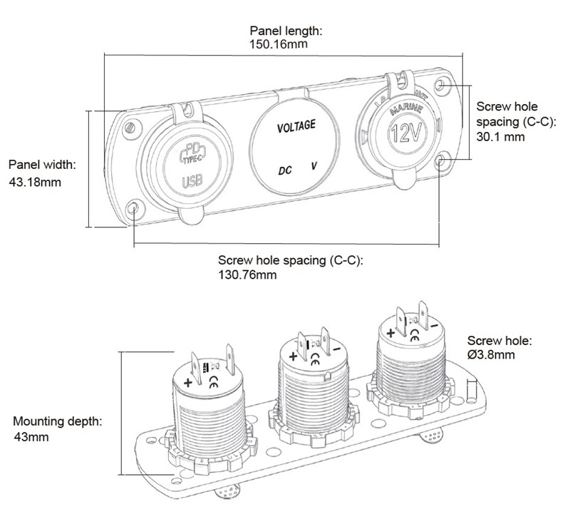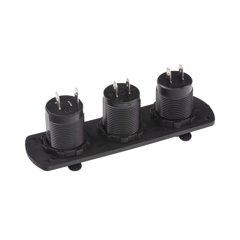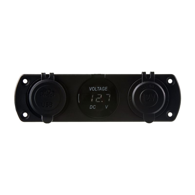 Krátký popis Trojitá zásuvka do panelu s voltmetrem, CL, 1x USB-A, 1x USB-C, nabíječka voděodolná.   Techni