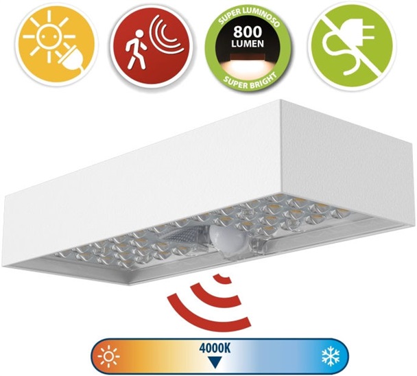 Solární svítidlo s UV ochranou, odolné vůči nárazu a vodě. Nabíjí se slunečními paprsky, má noční režim s 50% jasem a senzor pohybu. Vybaveno LED SMD diodami, 4000 K světlem, 2,8W panelem a 3000mAh baterií. Rozměry: 230x97x42 mm.