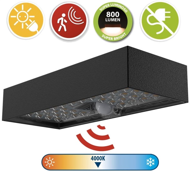 Solární svítidlo s UV ochranou, odolné vůči nárazu a vodě. Nabíjí se slunečními paprsky, má noční režim s 50% jasem a senzor pohybu. Vybaveno LED SMD diodami, 4000 K světlem, 2,8W panelem a 3000mAh baterií. Rozměry: 230x97x42 mm.